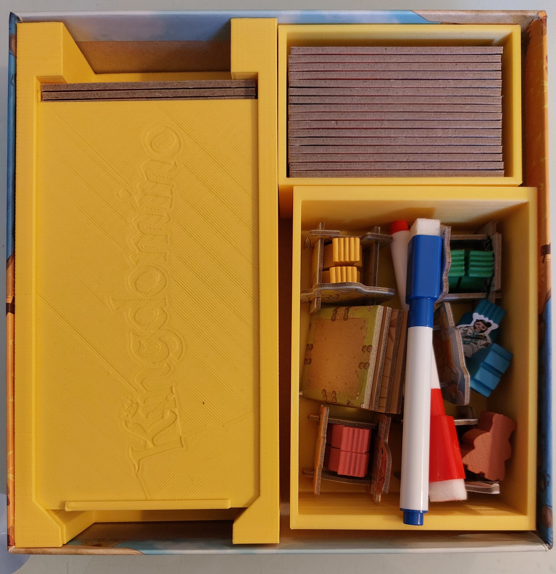 Le jeu de base avec tour à domino + châteaux + feuilles de score et feutres + les quêtes de l’extension Age des géants rentrent dansa boîte de base