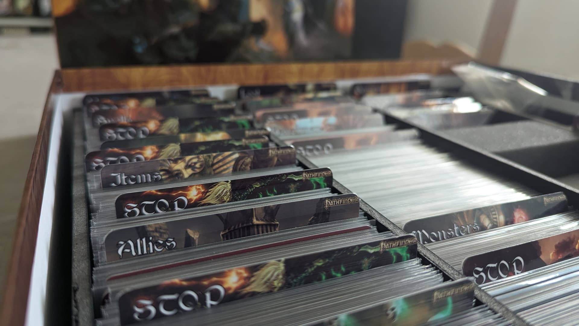 Insert custom, intercalaires réalisés par mes soins (avec pour chaque type de carte un intercalaire « stop » pour différencier les cartes disponibles et indisponibles), entièrement sleevé en paladin. Joué une fois.