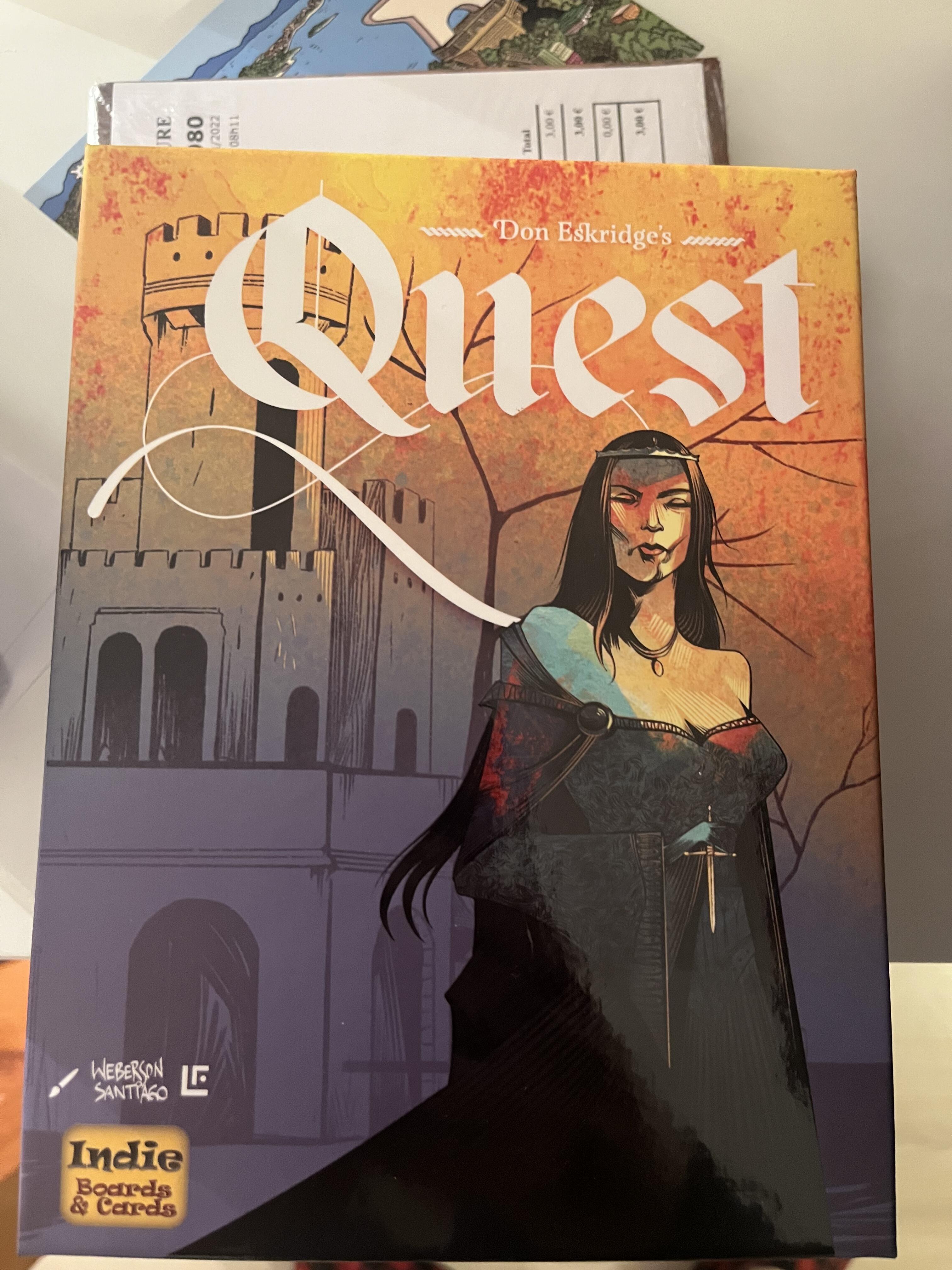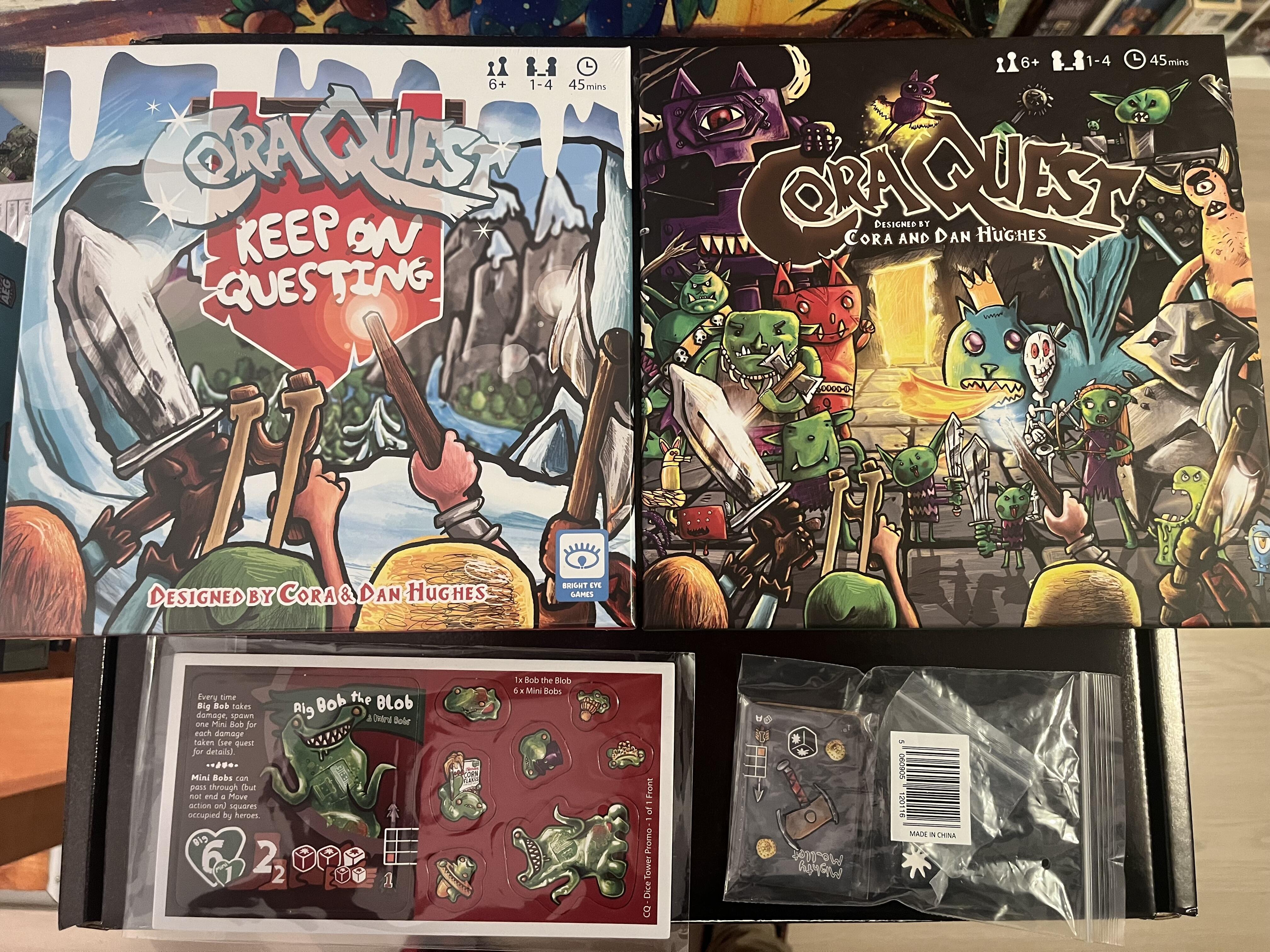 Cora quest + extension + goodies 50€ (j’ai l’impression que c’est le prix mais dites moi si je suis à côté de la plaque pour le prix, faut que ça parte). L’anglais est facile pour traduire à la volée et jouer avec ses enfants. #MonPremierDungeonCrawler