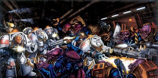 D’un autre côté, une fois qu’ils ont pompé l’idée de Space Marines, il est difficile de faire une illustration d’une bande de soldats submergé par des aliens qui ne ressemble pas à ça !