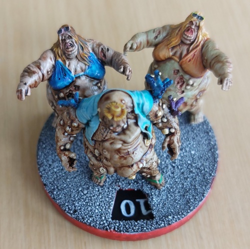 Pour minimiser les placements de figurines et aussi la peinture, j’ai fais des packs avec un socle tournant permettant de monter à 10 zombies par groupe. Le socle est recouvert de colle (vernis colle pour être précis) et recouvert de sable fin. Une fois le travail fait, je tasse le socle sur une surface plane pour avoir un effet asphalte. Pour la peinture vous pouvez faire soit une contraste grise sur peinture blanche, soit faire un shader noir sur peinture blanche ou gris claire. Les deux marchent très bien.