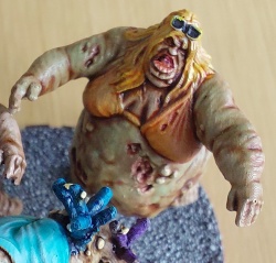 sous couche verte zombie (peinture de la gamme Zombicide du set army painter) puis une contraste peau (Gulliman Flesh de chez Citadelle). Le résultat est pas trop mal et fait une peau très verte. Vous pouvez éclaircir le vert avec un peu de blanc si vous voulez un truc plus livide. La teinte peau étant assez peu contrastée par rapport au vert, vous pouvez aussi utiliser un shader peau qui contraste bien plus et qui s’utilise en théorie sur une base rose.